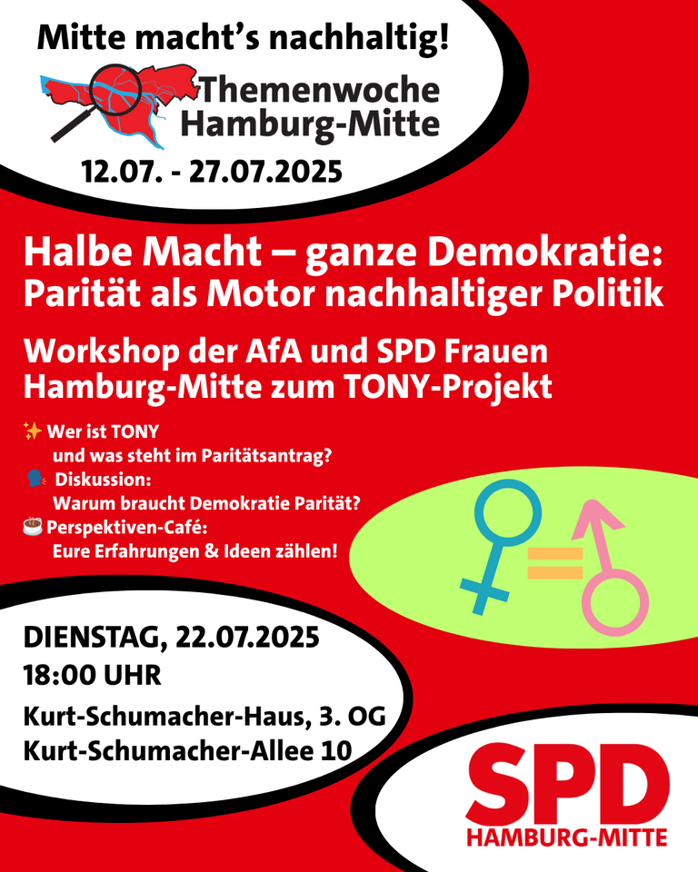 Wie nachhaltig ist unsere Demokratie, wenn die Hälfte der Gesellschaft in politischen Gremien fehlt? Die SPD Frauen Hamburg-Mitte laden zum Workshop zum TONY-Projekt ein.